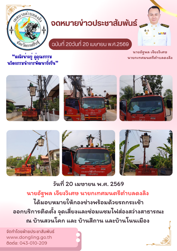 วันที่ 20 เมษายน พ.ศ. 2569 นายอัฐพล เจียงวิเศษ นายกเทศมนตรีตำบลดงลิงได้มอบหมายให้กองช่างพร้อมด้วยรถกระเช้าออกบริการติดตั้ง จุดเสี่ยงและซ่อมแซมไฟส่องสว่างสาธารณะ ณ บ้านสวนโคก และ บ้านสีถาน และบ้านโนนเม