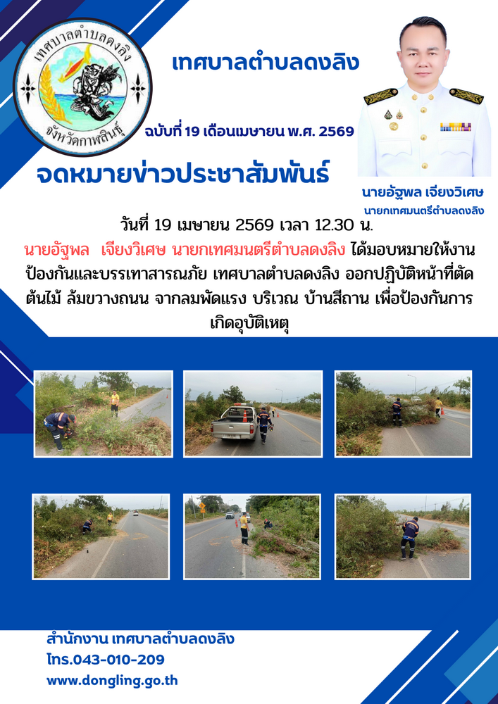 วันที่ 19 เมษายน 2569 เวลา 12.30 น. นายอัฐพล เจียงวิเศษ นายกเทศมนตรีตำบลดงลิง ได้มอบหมายให้งาน ป้องกันและบรรเทาสารณภัย เทศบาลตำบลดงลิง ออกปฏิบัติหน้าที่ตัด ต้นไม้ ล้มขวางถนน จากลมพัดแรง บริเวณ บ้านสีถ