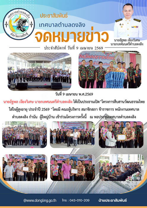 วันที่ 9 เมษายน พ.ศ.2569 นายอัฐพล เจียงวิเศษ นายกเทศมนตรีตำบลดงลิง ได้เป็นประธานเปิด"โครงการสืบสานวัฒนธรรมไทยใส่ใจผู้สูงอายุ ประจำปี 2569 "โดยมี คณะผู้บริหาร สมาชิกสภา ข้าราชการ พนักงานเทศบาลตำบลดงลิง