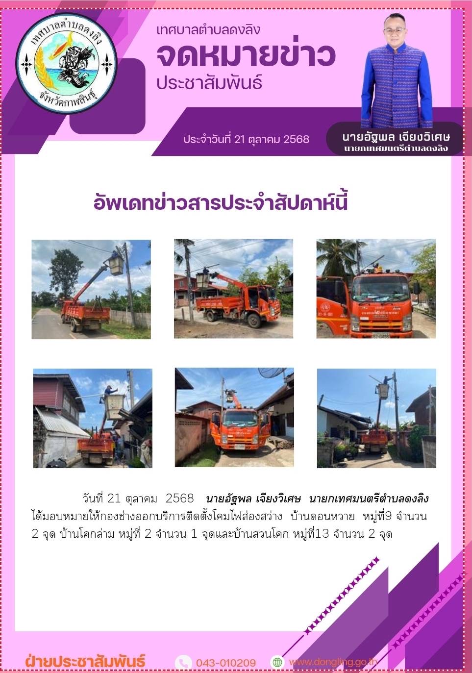 วันที่ 21 ตุลาคม 2568 นายอัฐพล เจียงวิเศษ นายกเทศมนตรีตำบลดงลิง ได้มอบหมายให้กองช่างออกบริการติดตั้งโคมไฟส่องสว่าง บ้านดอนหวาย หมู่ที่9 จำนวน 2 จุด บ้านโคกล่าม หมู่ที่ 2 จำนวน 1 จุดและบ้านสวนโคก หมู่ท