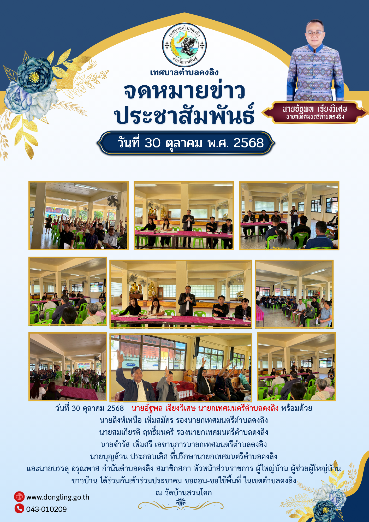 วันที่ 30 ตุลาคม 2568 นายอัฐพล เจียงวิเศษ นายกเทศมนตรีตำบลดงลิง พร้อมด้วย นายสิงห์เหนือ เห็มสมัคร รองนายกเทศมนตรีตำบลดงลิงนายสมเกียรติ ฤทธิ์มนตรี รองนายกเทศมนตรีตำบลดงลิง นายจารัส เห็มศรี เลขานุการนาย