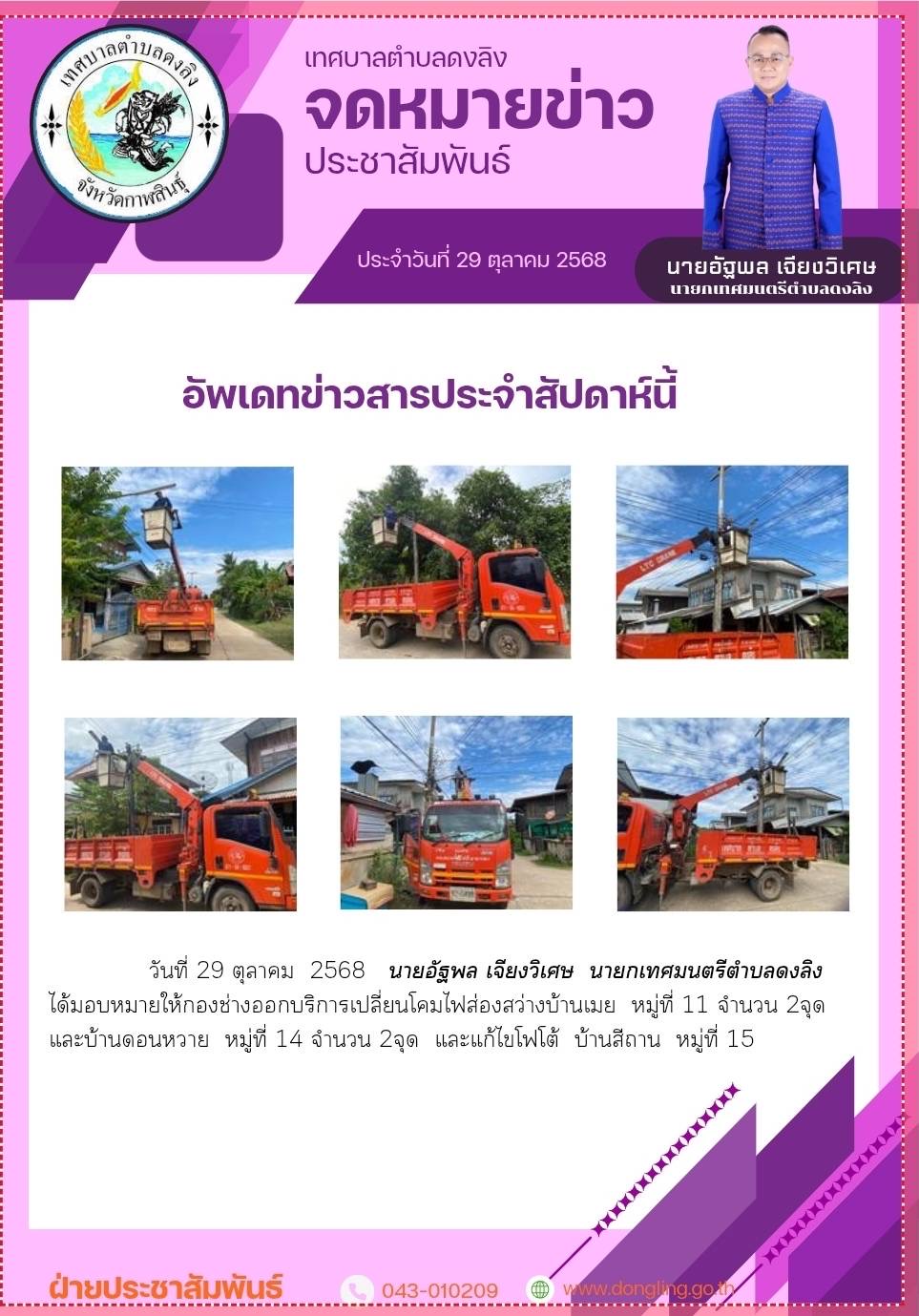 วันที่ 29 ตุลาคม 2568 นายอัฐพล เจียงวิเศษ นายกเทศมนตรีตำบลดงลิง ได้มอบหมายให้กองช่างออกบริการเปลี่ยนโคมไฟส่องสว่างบ้านเมย หมู่ที่ 11 จำนวน 2จุดและบ้านดอนหวาย หมู่ที่ 14 จำนวน 2จุด และแก้ไขโฟโต้ บ้านสี