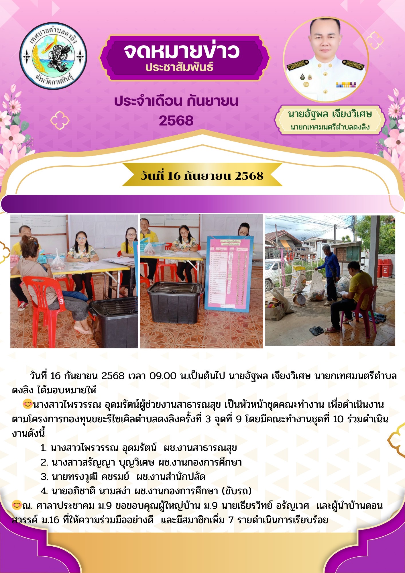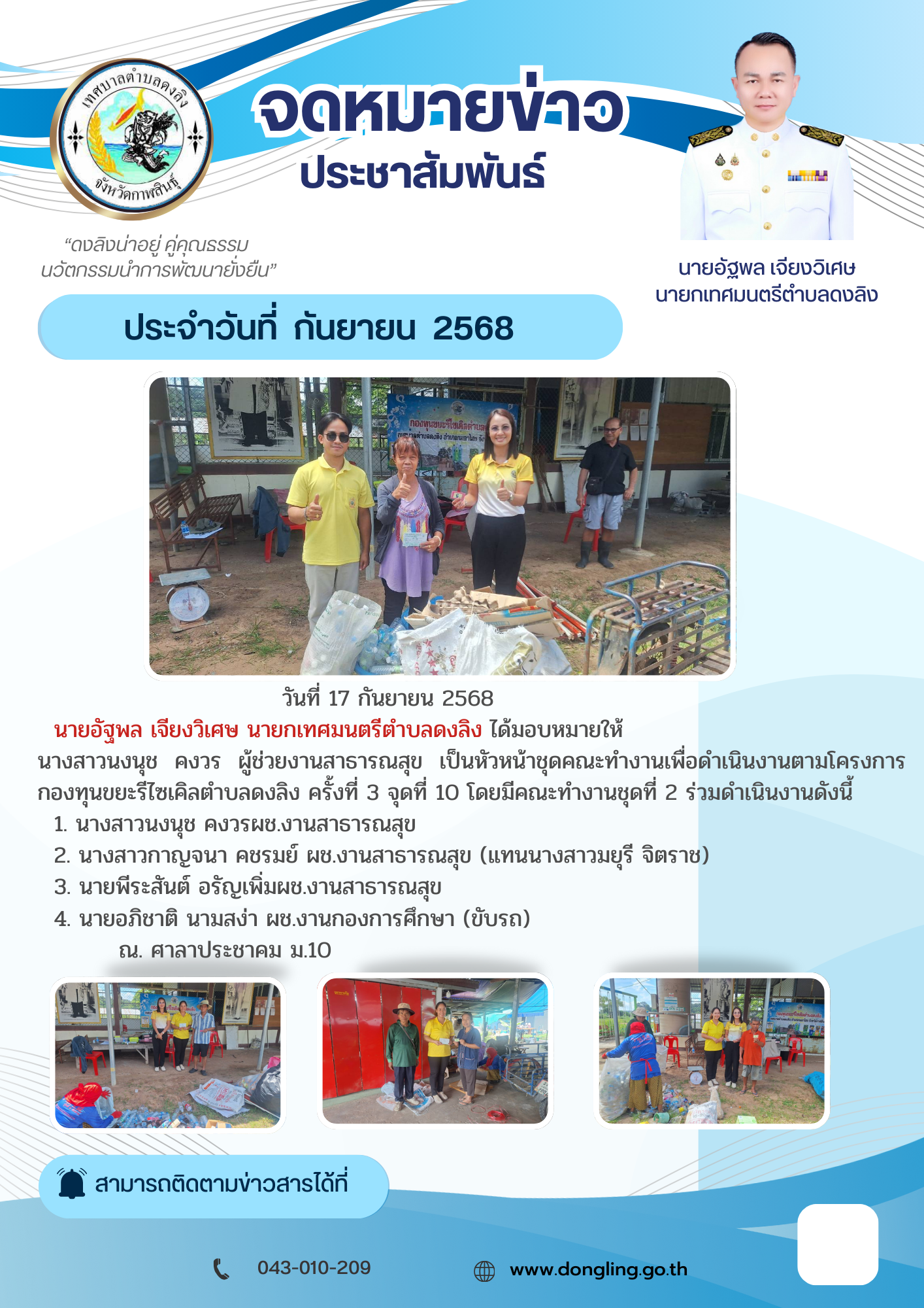 วันที่ 17 กันยายน 2568 นายอัฐพล เจียงวิเศษ นายกเทศมนตรีตำบลดงลิง ได้มอบหมายให้นางสาวนงนุช คงวร ผู้ช่วยงานสาธารณสุข เป็นหัวหน้าชุดคณะทำงานเพื่อดำเนินงานตามโครงการกองทุนขยะรีไซเคิลตำบลดงลิง ครั้งที่ 3 จุดที่ 10 โดยมีคณะทำงานชุดที่ 2 ร่วมดำเนินงานดังนี้ 1. น |