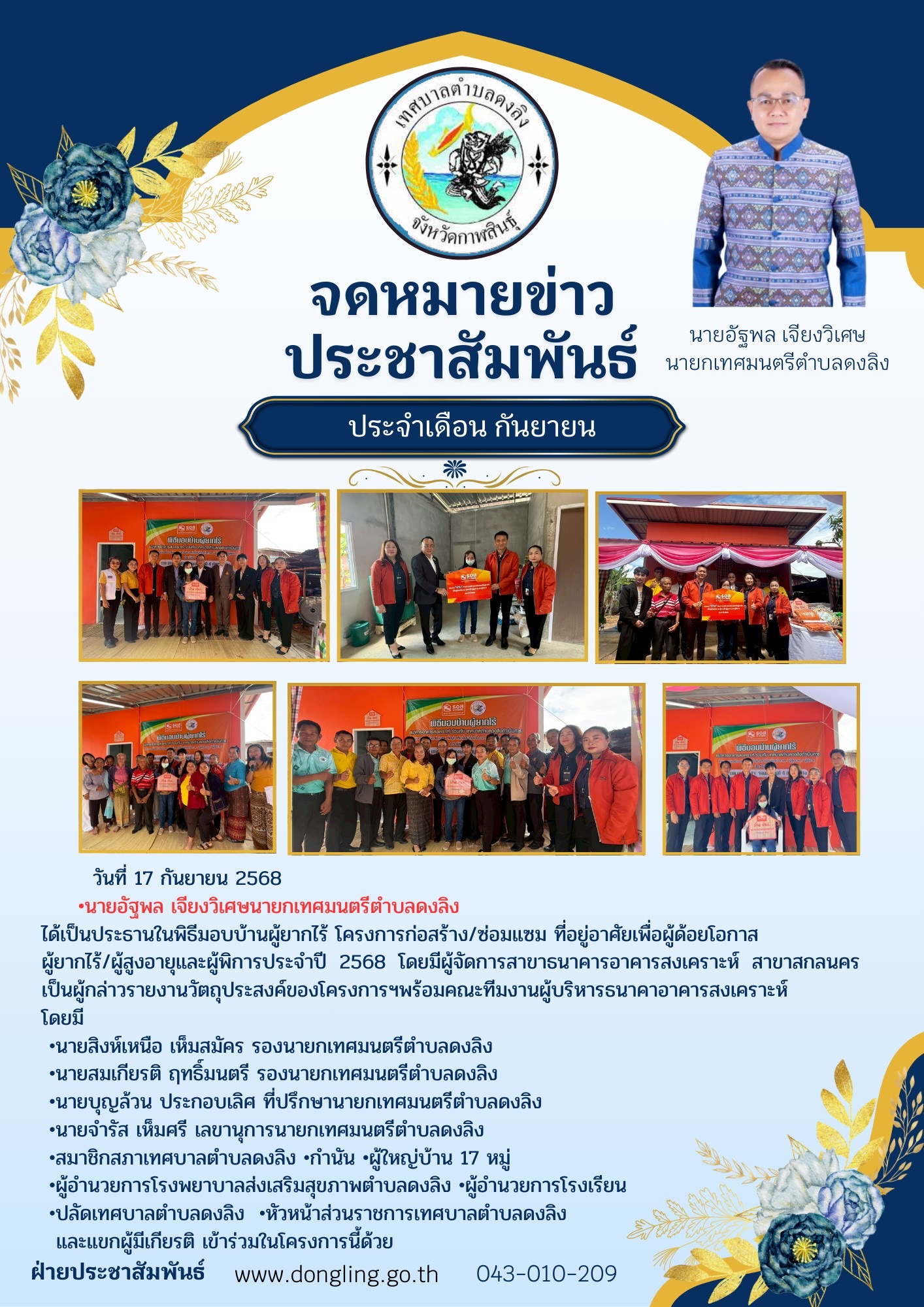 วันที่ 30 ตุลาคม 2568 นายอัฐพล เจียงวิเศษ นายกเทศมนตรีตำบลดงลิง พร้อมด้วย นายสิงห์เหนือ เห็มสมัคร รองนายกเทศมนตรีตำบลดงลิงนายสมเกียรติ ฤทธิ์มนตรี รองนายกเทศมนตรีตำบลดงลิง นายจารัส เห็มศรี เลขานุการนายกเทศมนตรีต้าบลดงลิงนายบุญล้วน ประกอบเลิศ ที่ปรึกษานายกเ |