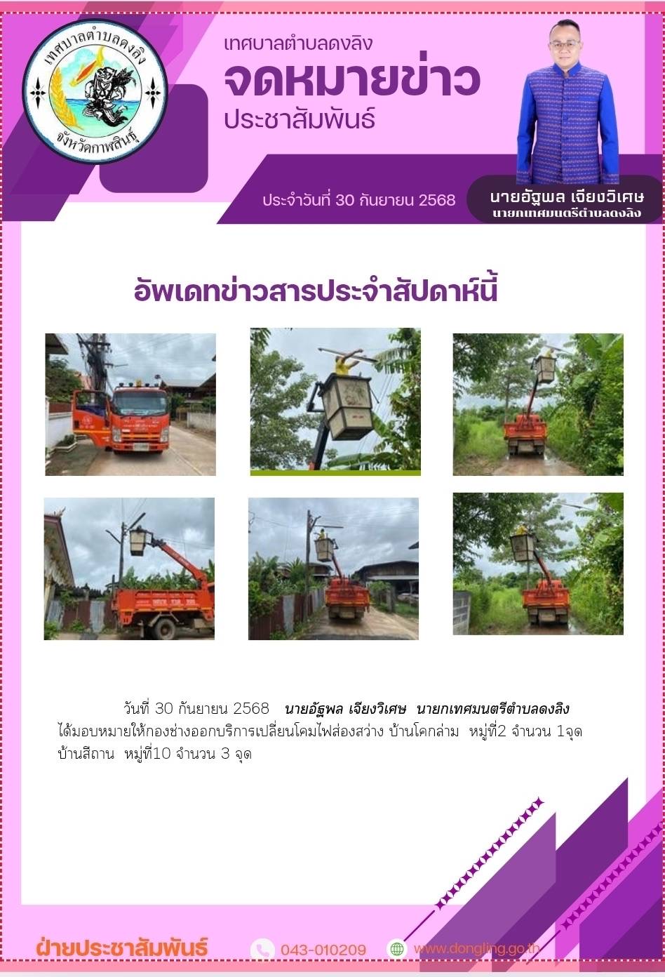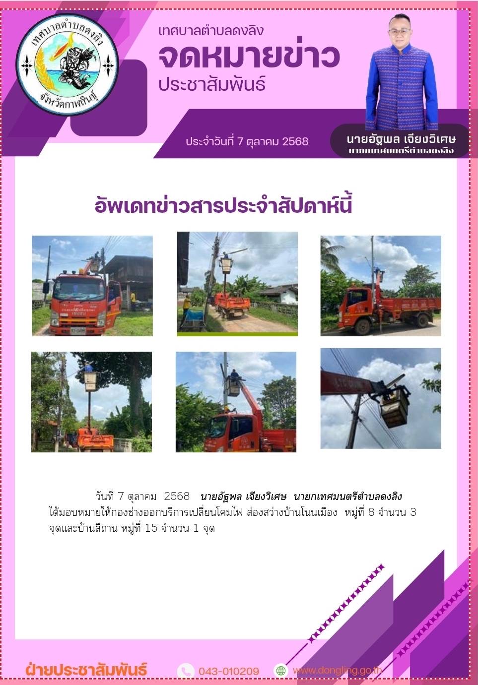 วันที่ 7 ตุลาคม 2568 นายอัฐพล เจียงวิเศษ นายกเทศมนตรีตำบลดงลิงได้มอบหมายให้กองช่างออกบริการเปลี่ยนโคมไฟ ส่องสว่างบ้านโนนเมือง หมู่ที่ 8 จำนวน 3 จุดและบ้านสีถาน หมู่ที่ 15 จำนวน 1 จุด |