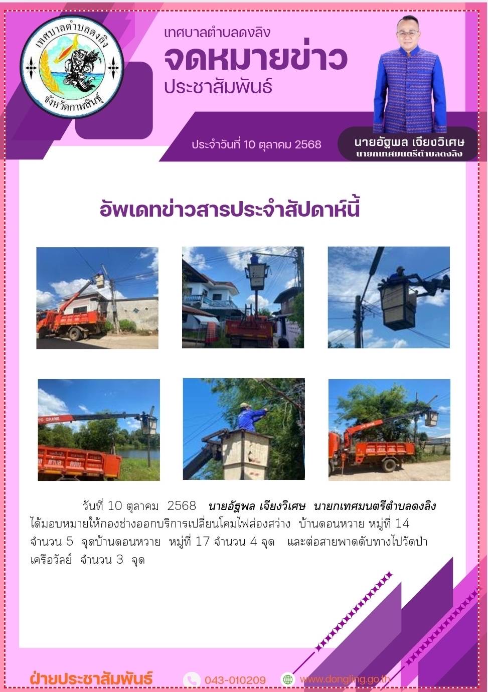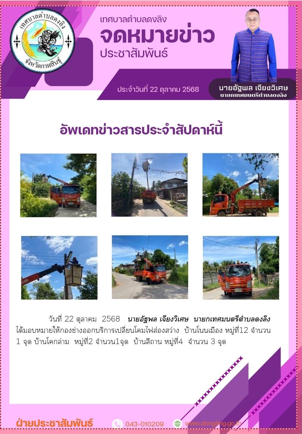 วันที่ 22 ตุลาคม 2568 นายอัฐพล เจียงวิเศษ นายกเทศมนตรีตำบลดงลิง ได้มอบหมายให้กองช่างออกบริการเปลี่ยนโคมไฟส่องสว่าง บ้านโนนเมือง หมู่ที่12 จำนวน 1 จุด บ้านโคกล่าม หมู่ที่2 จำนวน1จุด บ้านสีถาน หมู่ที่4 จำนวน 3 จุด |