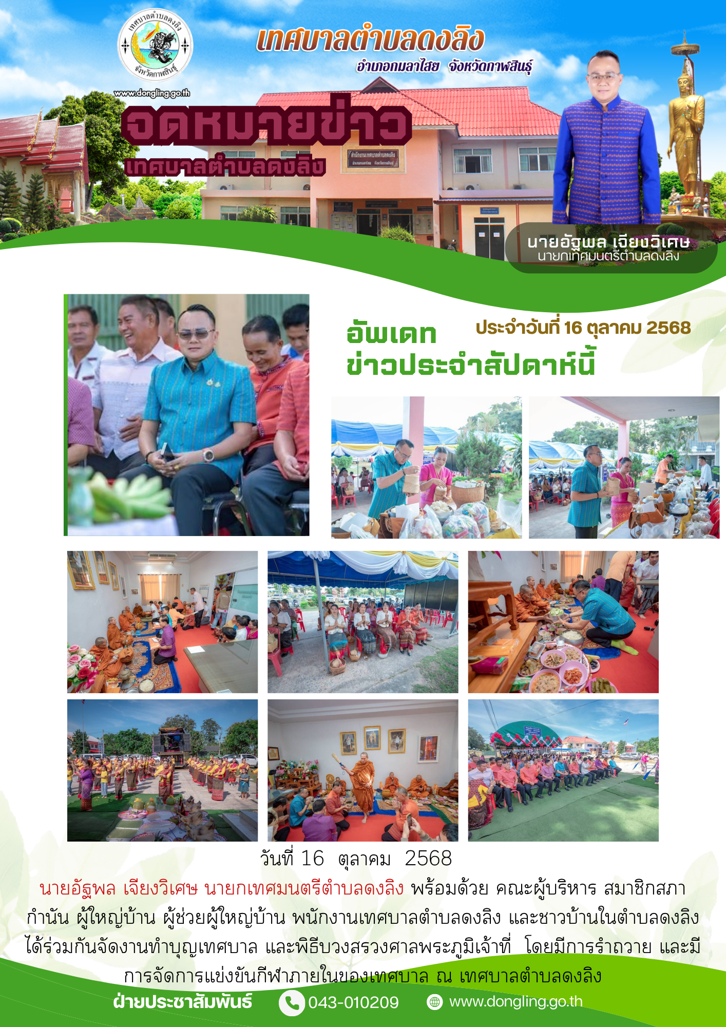 วันที่ 16 ตุลาคม 2568 นายอัฐพล เจียงวิเศษ นายกเทศมนตรีตำบลดงลิง พร้อมด้วย คณะผู้บริหาร สมาชิกสภา กำนัน ผู้ใหญ่บ้าน ผู้ช่วยผู้ใหญ่บ้าน พนักงานเทศบาลตําบลดงลิง และชาวบ้านในตำบลดงลิง ได้ร่วมกันจัดงานทำบุญเทศบาล และพิธีบวงสรวงศาลพระภูมิเจ้าที่ โดยมีการรำ |