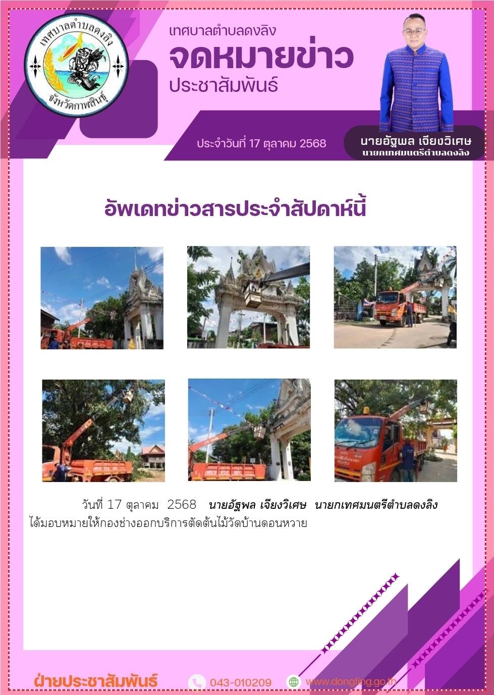 วันที่ 17 ตุลาคม 2568 นายอัฐพล เจียงวิเศษ นายกเทศมนตรีตำบลดงลิง ได้มอบหมายให้กองช่างออกบริการตัดต้นไม้วัดบ้านดอนหวาย |