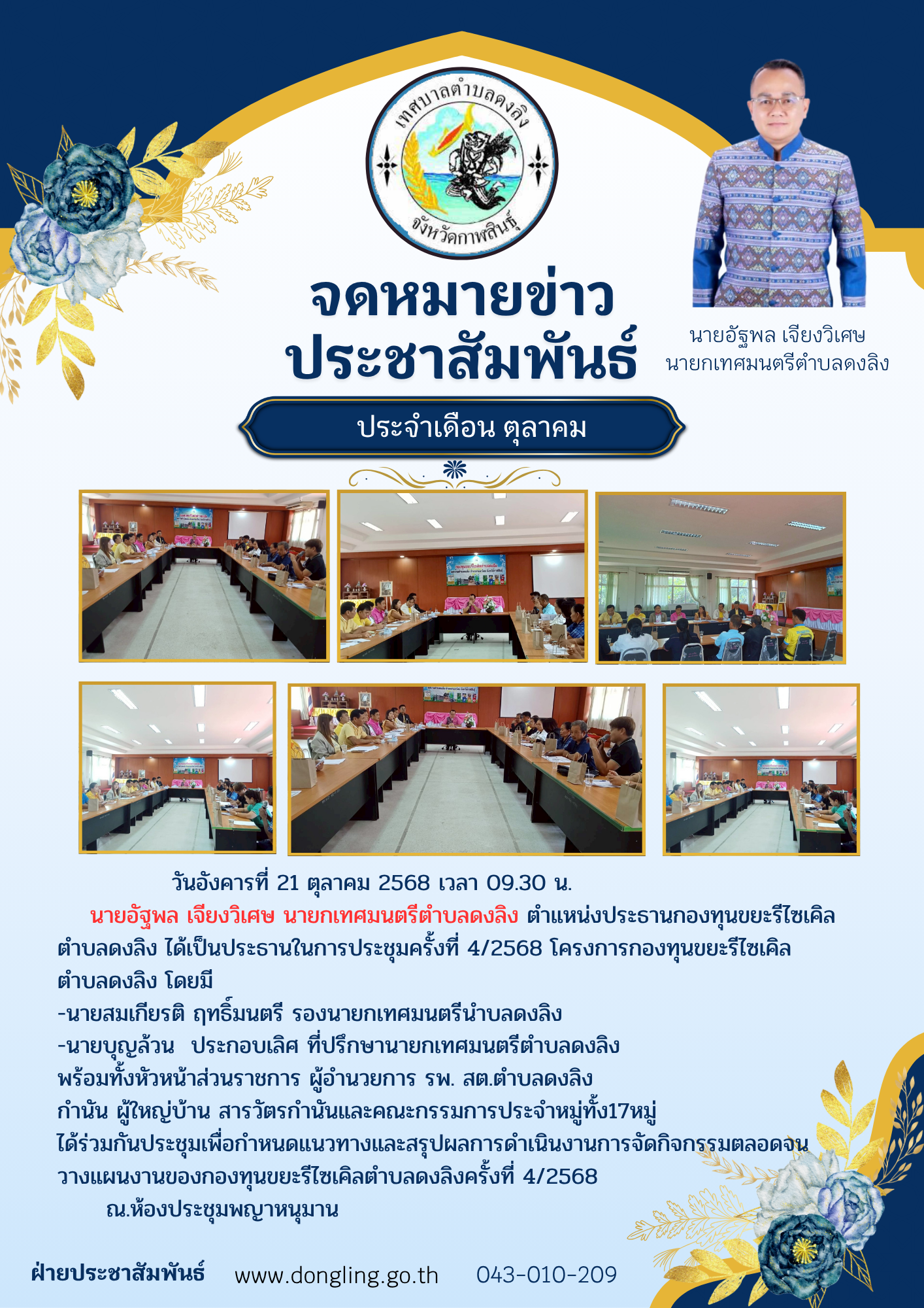 วันอังคารที่ 21 ตุลาคม 2568 เวลา 09.30 น. นายอัฐพล เจียงวิเศษ นายกเทศมนตรีตำบลดงลิง ตำแหน่งประธานกองทุนขยะรีไซเคิลตำบลดงลิง ได้เป็นประธานในการประชุมครั้งที่ 4/2568 โครงการกองทุนขยะรีไซเคิลตำบลดงลิง โดยมี -นายสมเกียรติ ฤทธิ์มนตรี รองนายกเทศมนตรีนำบลดงลิง - |