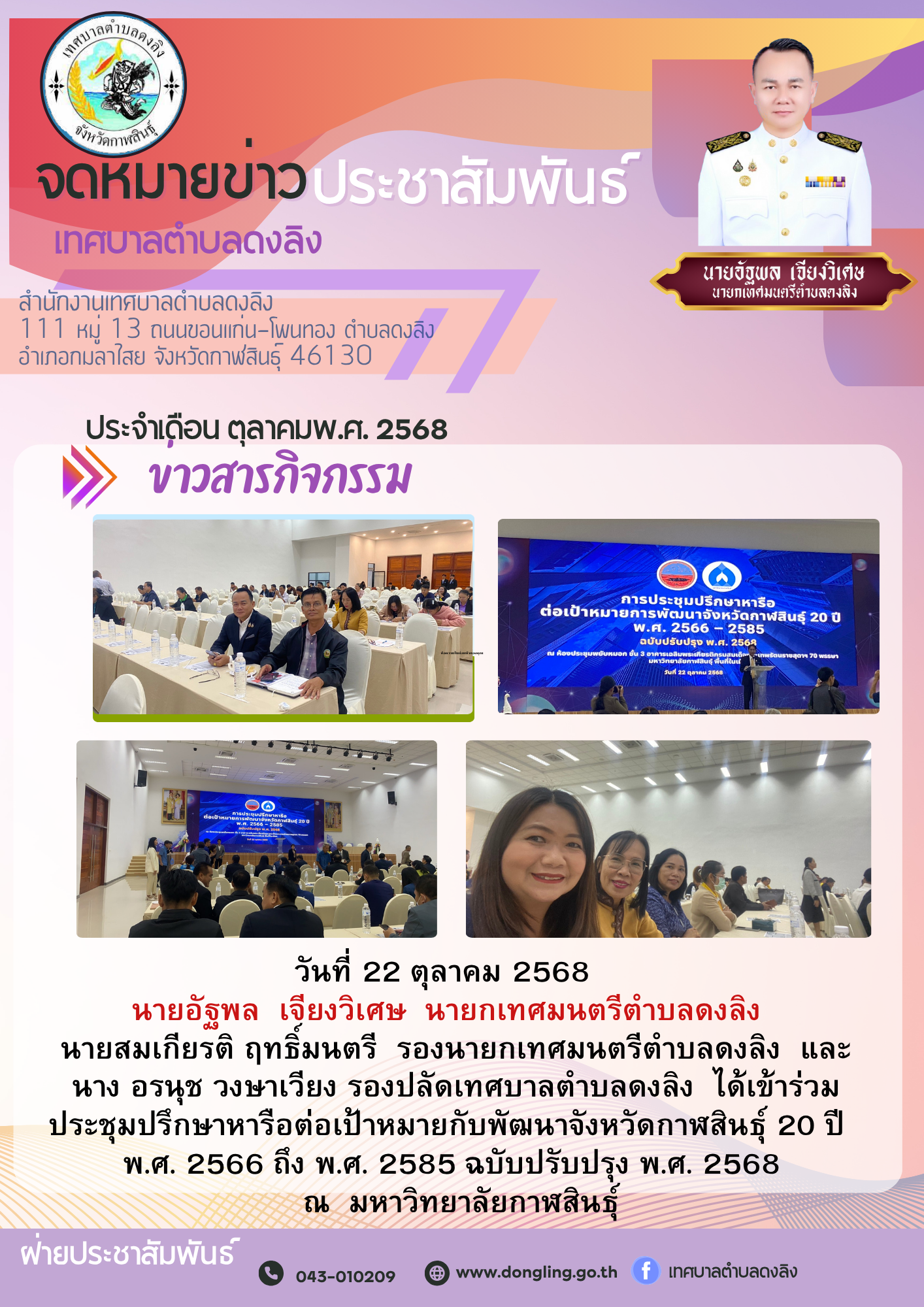 วันที่ 22 ตุลาคม 2568 นายอัฐพล เจียงวิเศษ นายกเทศมนตรีตำบลดงลิงนายสมเกียร์ติ ฤทธิ์มนตรี รองนายกเทศมนตรีตำบลดงลิง และนาง อรนุช วงษาเวียง รองปลัดเทศบาลตำบลดงลิง ได้เข้าร่วมประชุมปรึกษาหารือต่อเป้าหมายกับพัฒนาจังหวัดกาฬสินธุ์ 20 ปี พ.ศ. 2566 ถึง พ.ศ. 2585 ฉบ |