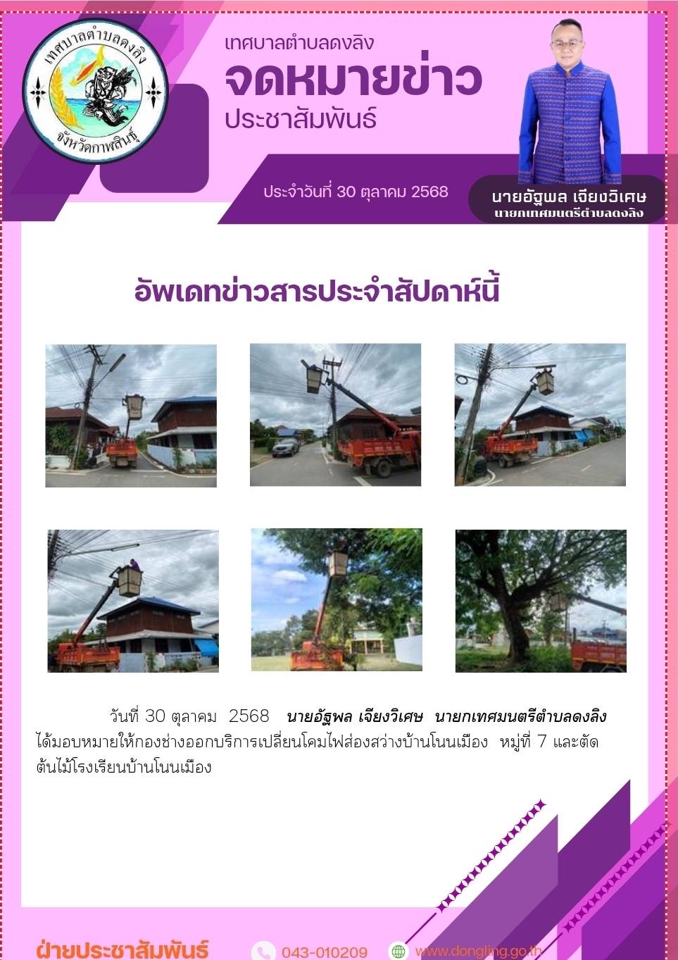 วันที่ 30 ตุลาคม 2568 นายอัฐพล เจียงวิเศษ นายกเทศมนตรีตำบลดงลิง ได้มอบหมายให้กองช่างออกบริการเปลี่ยนโคมไฟส่องสว่างบ้านโนนเมือง หมู่ที่ 7 และตัด ต้นไม้โรงเรียนบ้านโนนเมือง |