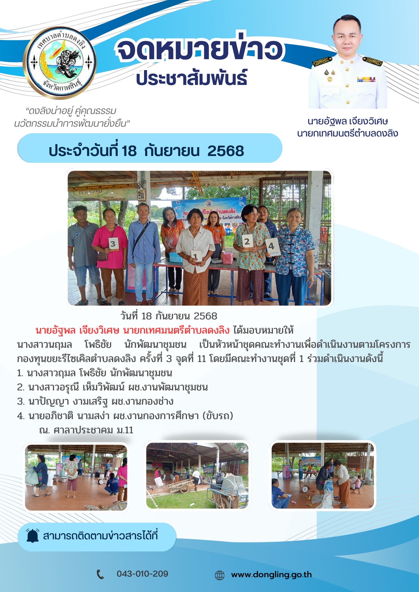 วันที่ 18 กันยายน 2568 นายอัฐพล เจียงวิเศษ นายกเทศมนตรีตำบลดงลิง ได้มอบหมายให้ นางสาวนฤมล โพธิชัย นักพัฒนาชุมชน เป็นหัวหน้าชุดคณะทำงานเพื่อดำเนินงานตามโครงการ กองทุนขยะรีไซเคิลตำบลดงลิง ครั้งที่ 3 จุดที่ 11 โดยมีคณะทำงานชุดที่ 1 ร่วมดำเนินงานดังนี้ 1. นาง