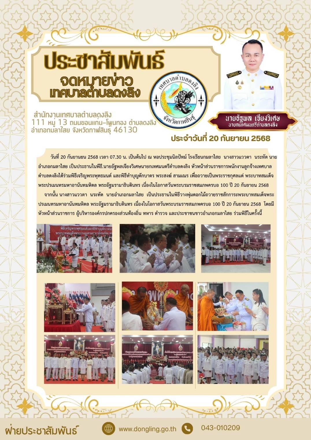วันที่ 20 กันยานยน 2568 เวลา 07.30 น. เป็นต้นไป ณ หอประชุมนิลปัทม์ โรงเรียนกมลาไสย นางสาวแววตา นระทัด นายอำเภอกมลาไสย เป็นประธานในพีธี.นายอัฐพลเจียงวิเศษนายกเทศมนตรีตำบลดงลิง หัวหน้าส่วนราชการ̴