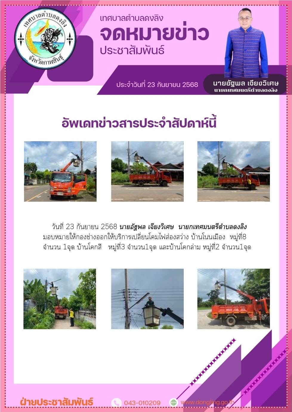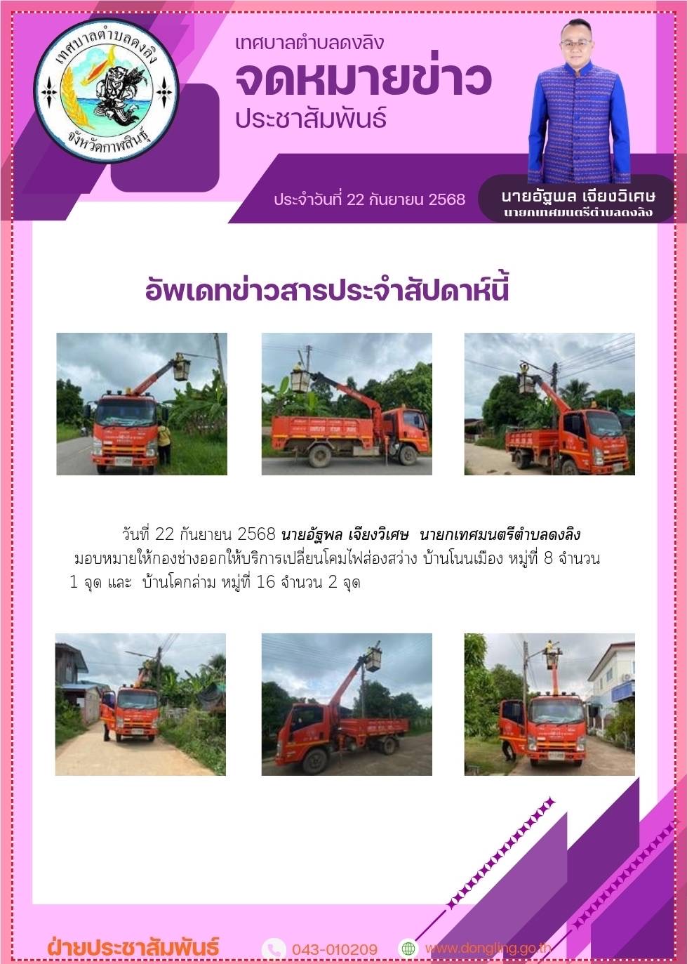 วันที่ 22 กันยายน 2568 นายอัฐพล เจียงวิเศษ นายกเทศมนตรีตำบลดงลิงมอบหมายให้กองช่างออกให้บริการเปลี่ยนโคมไฟส่องสว่าง บ้านโนนเมือง หมู่ที่ 8 จำนวน 1 จุด และ บ้านโคกล่าม หมู่ที่ 16 จำนวน 2 จุด
