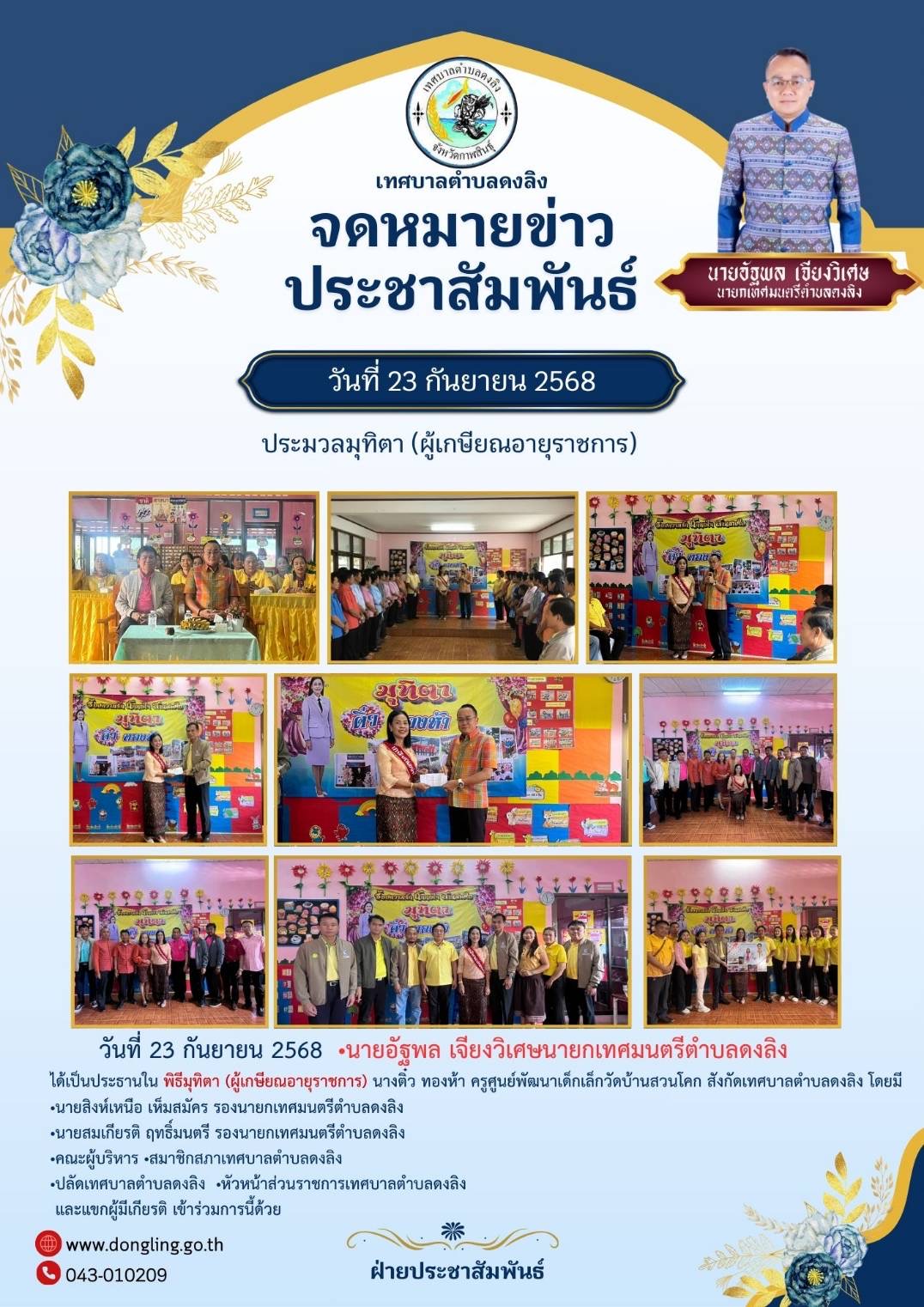 วันที่ 23 กันยายน 2568 นายอัฐพล เจียงวิเศษนายกเทศมนตรีตำบลดงลิงได้เป็นประธานใน พิธีมุทิตา (ผู้เกษียณอายุราชการ) นางติว ทองห้า ครูศูนย์พัฒนาเด็กเล็กวัดบ้านสวนโคก สังกัดเทศบาลต้าบลดงลิง โดยมั นายสิงห์เหนือ เห็มสมัคร รองนายกเทศมนตรีตำบลดงลิง นายสมเกียรติ