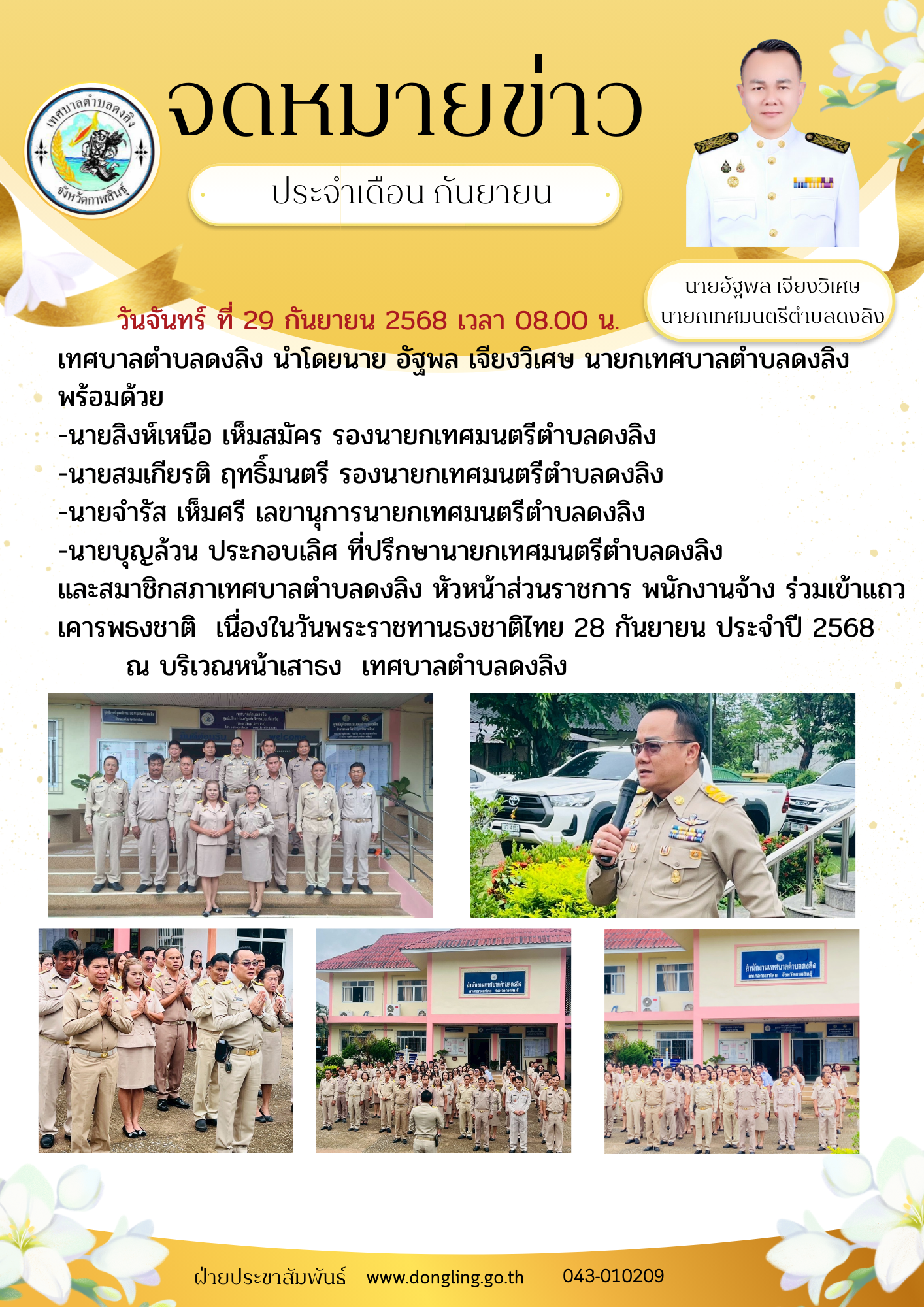 วันจันทร์ ที่ 29 กันยายน 2568 เวลา 08.00 น. นายกเทศมนตรีตำบลดงลิง เทศบาลตำบลดงลิง นำโดยนาย อัฐพล เจียงวิเศษ นายกเทศบาลตำบลดงลิงพร้อมด้วย -นายสิงห์เหนือ เห็มสมัคร รองนายกเทศมนตรีตำบลดงลิง -นายสมเกียรติ ฤทธิ์มนตรี รองนายกเทศมนตรีตำบลดงลิง -นายจำรัส เห็มศรี